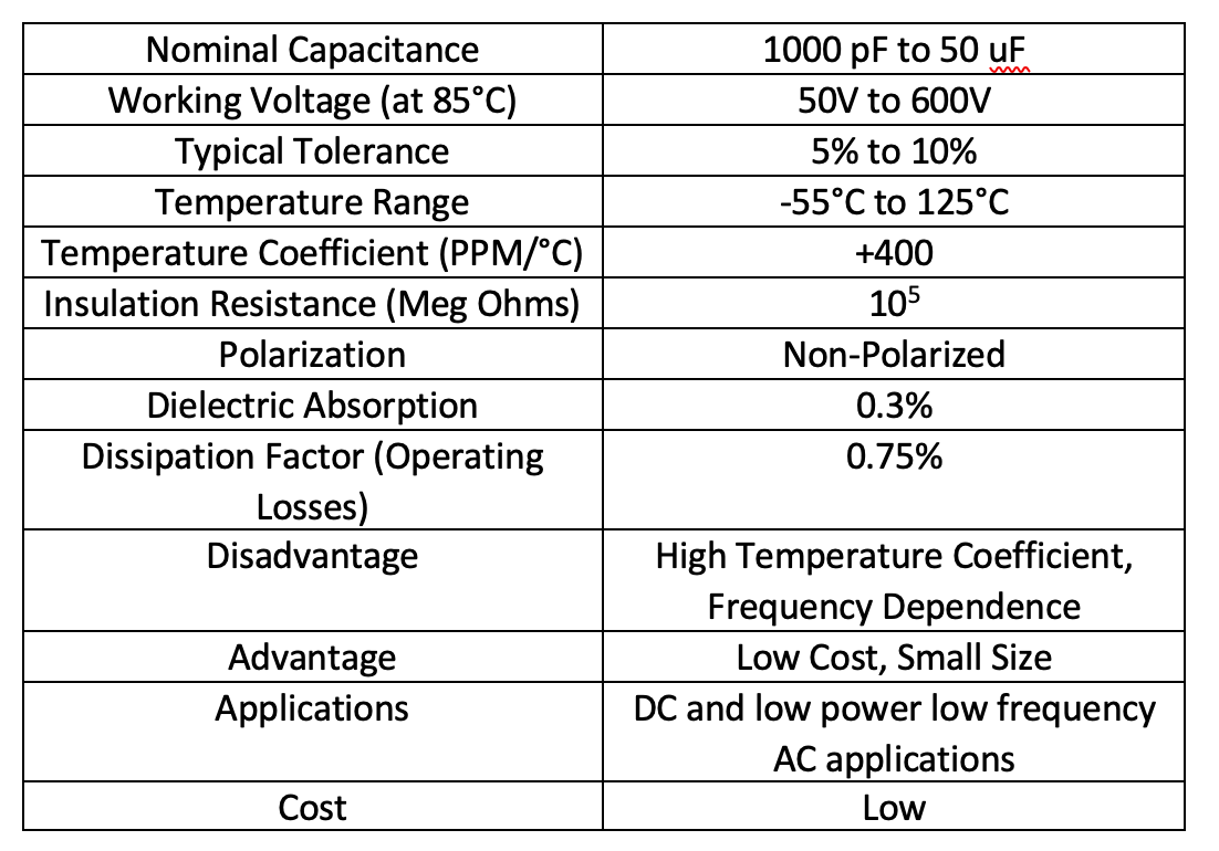 3) Polypropylene (PP) Film – These are the most popular plastic film capacitors and are known for low-temperature coefficient, low operating losses, low moisture absorption, and stability at high temperature and high power. However, these capacitors are prone to damage and breakdown due to transient overvoltages and voltage reversals. They have the following technical specifications: