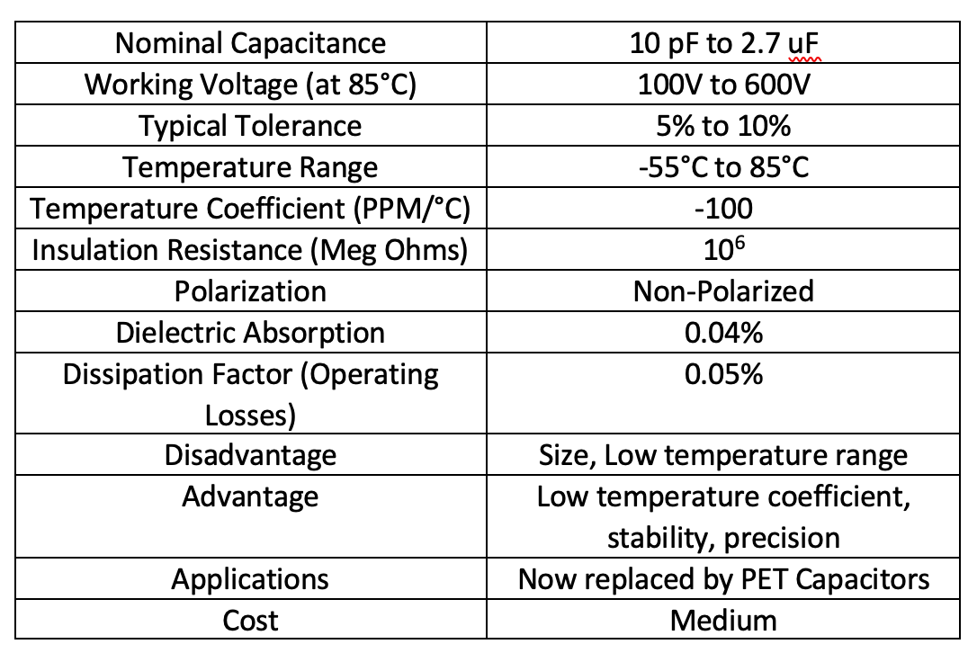 5) Polysulphone Film – Polysulphone capacitors are similar to Polycarbonate capacitors and are known for their thermal stability. There are limited manufacturers of these capacitors, which are not readily available. These capacitors have the following technical specifications: