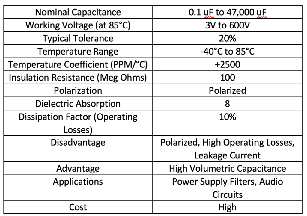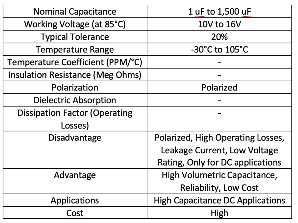 1) Aluminum Electrolytic – These capacitors use aluminum foil as an anode and aluminum oxide as a dielectric medium. They can have Ethylene Glycol, Dimethylacetamide, gamma-Butyrolactone, or Dimethylformamide as a liquid electrolytic, Manganese Dioxide, or conductive polymer as a solid electrolytic. These capacitors have the following technical specifications: