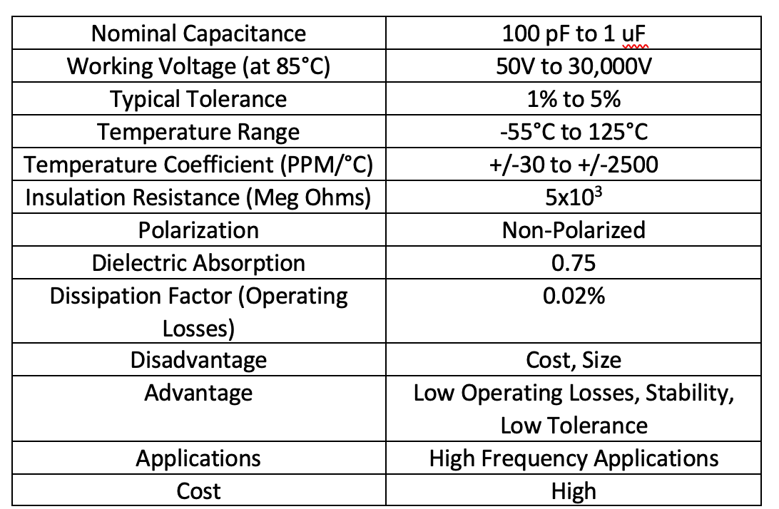 These costly capacitors are best known for their robustness, stability, accuracy, and reliability in extreme environmental conditions. They are even resistant to nuclear radiation and are most suitable for military-grade applications. These capacitors have the following technical specifications: