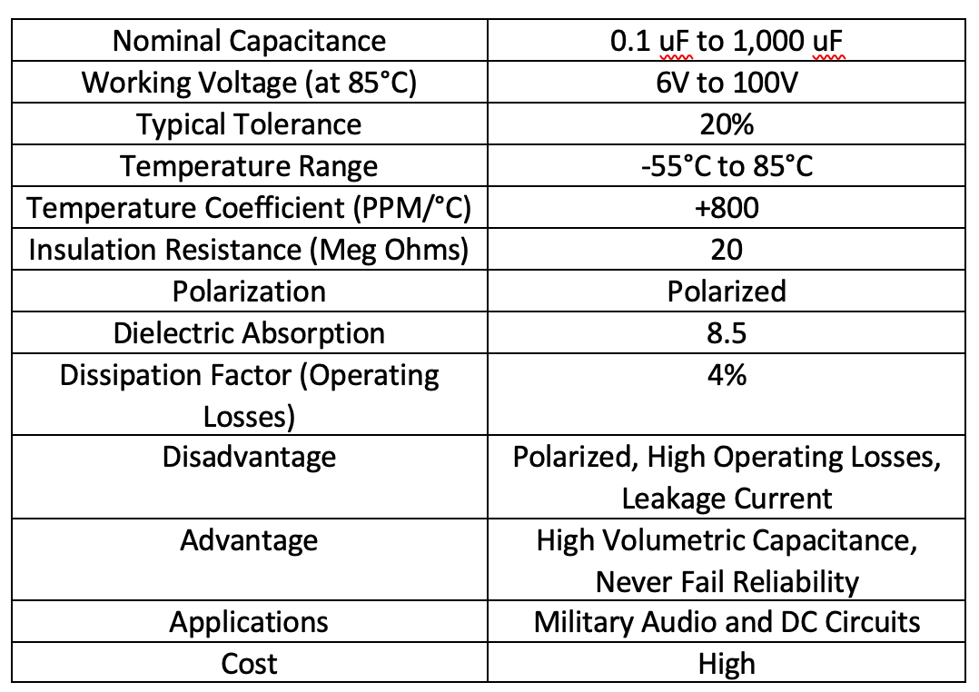 2) Tantalum Electrolytic – These capacitors use Tantalum as an anode and Tantalum Oxide as a dielectric medium. They can have Sulphuric Acid, Manganese Dioxide, or conductive polymer as an electrolytic and are highly reliable, efficient, and smaller than aluminum electrolytic types. They are often used in military applications because of their stability and reliability. These capacitors have the following technical specifications: