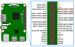 This image shows the location of the serial TTL port (the Tx and Rx pins of the primary UART and the hardware serial port on RPi) on RPi’s GPIO header:
